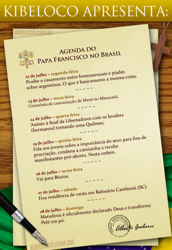 Senhoras e senhores, o Kibe Loco teve acesso com exclusividade à agenda do Papa Francisco, o argentino. 🙂 Segue em primeiríssima mão:
