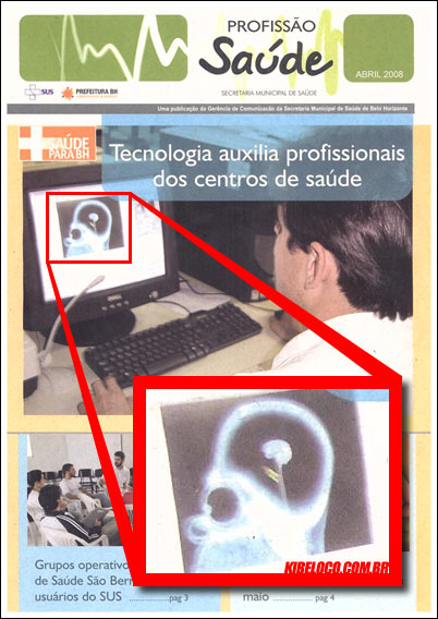 No entanto, o que nem todos perceberam, foi um detalhe na foto de capa que ilustrava a matéria intitulada “Tecnologia auxilia profissionais dos centros de saúde”. A imagem mostra o que seria um desses “profissionais” diante de uma radiografia exibida na tela de um computador.