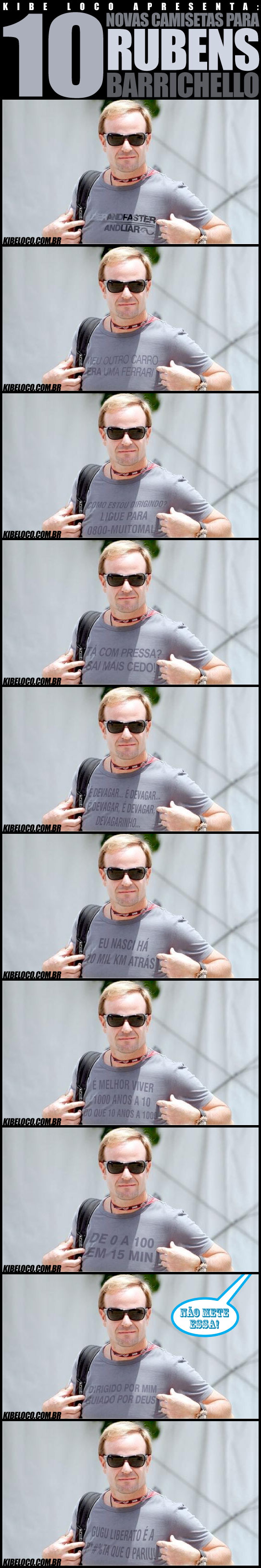 Rubens Barrichello chegou ao circuito de Sepang, na Malásia, com uma camiseta interessante. Nela estava estampada a frase “Older and faster” (“Mais velho e mais rápido” em português).