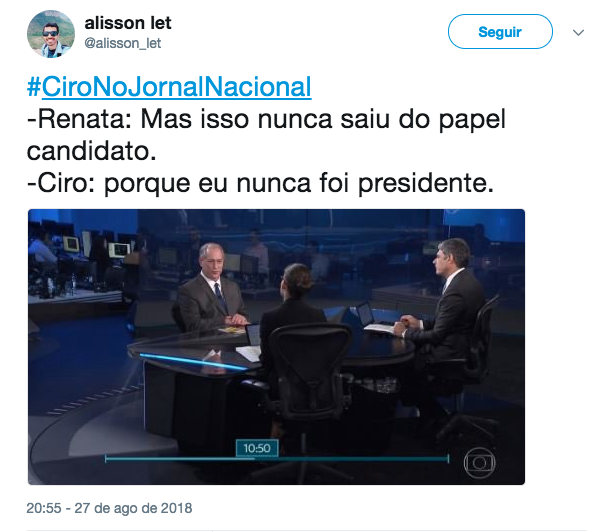 .#CiroNoJornalNacional#CiroNaGloboNews pic.twitter.com/kXWFFe40CF— Clebbing (@Clebbing) August 28, 2018