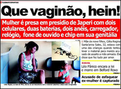 Célia Regina Santanna Sales, de 32 anos, foi presa depois que inspetoras de segurança do Complexo Prisional de Japeri (RJ) encontraram dois aparelhos celulares, um relógio, dois anéis, um carregador de celular, um fone de ouvido e um chip para celular escondidos em suas partes íntimas.